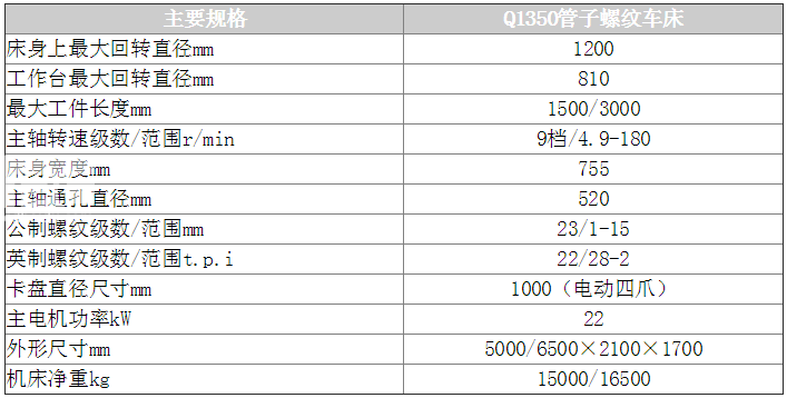 Q1350型管子螺紋車床是專為大口徑管件進行車削加工而設計的臥式車床,在具備普通車床的全部功能的同時,專業(yè)用于大口徑管件及棒件的加工,廣泛應用于機械制造、石油、化工、煤炭、地質勘探、城市給排水等行業(yè)的機械加工作業(yè);車床主軸通孔大、主軸箱前后均有卡盤、并配備有錐度杠,主軸通孔直徑520mm,可用于加工直徑范圍330mm-510mm的各種內外螺紋,包括公制、英制、錐度螺紋等,同時可對軸類、盤類零件進行外圓、內孔和端面的加工。
