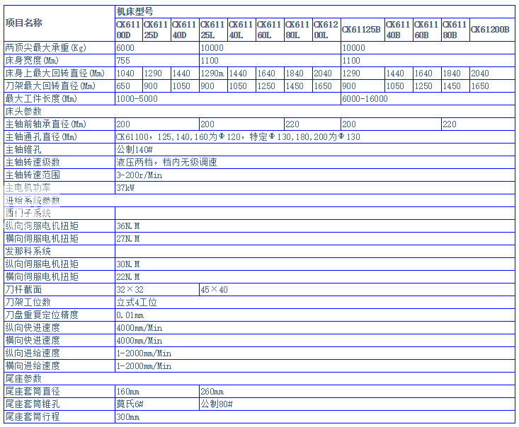 CK611系列機床為大型臥式平床身數(shù)控車床,采用SIEMENS或FANUC數(shù)控系統(tǒng),及全數(shù)字交流伺服系統(tǒng)。車削主傳動D,L,B,H型為自動兩擋無級變速,主電機為交流主軸電機,E,N型為手動四擋無級變速,主電機為交流電機,兩個聯(lián)動控制軸。中心距1-5M的機床Z軸和X軸采用滾珠絲杠副加交流伺服電機實現(xiàn)縱向和橫向移動;中心距6M以上的機床Z軸采用齒輪齒條加光柵尺,X軸采用滾珠絲杠副加交流伺服電機實現(xiàn)縱向和橫向移動,具有很好的定位和重復(fù)定位精度。